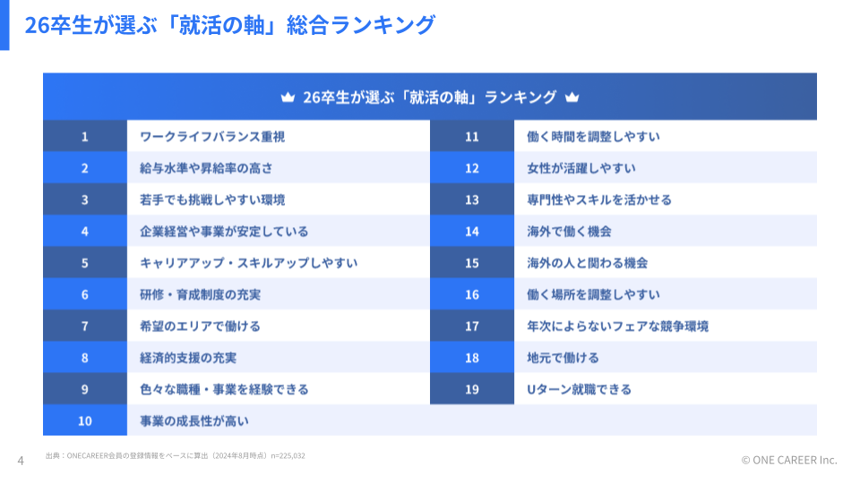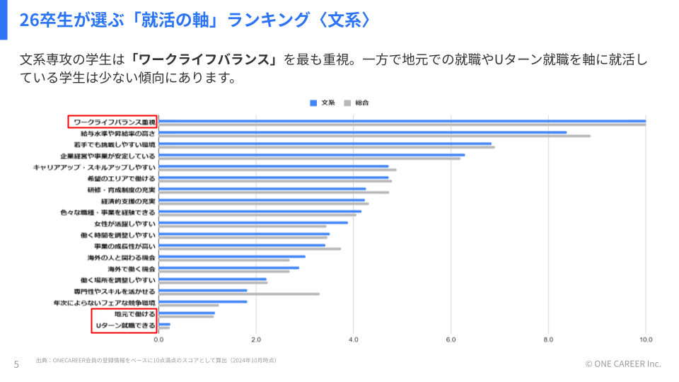 26年卒の学生にとって、就職先を選ぶ際の最重要ポイントは「ワークライフバランス」です。ワンキャリアのデータでも総合1位となっており、文系・理系どちらの学生においても圧倒的な支持を集めています。背景には、長時間労働がニュースで取り上げられる機会が増えたことや、大学生活中にリモート授業・オンライン環境を経験し、柔軟な働き方に価値を感じる学生が増えたことなどが挙げられます。