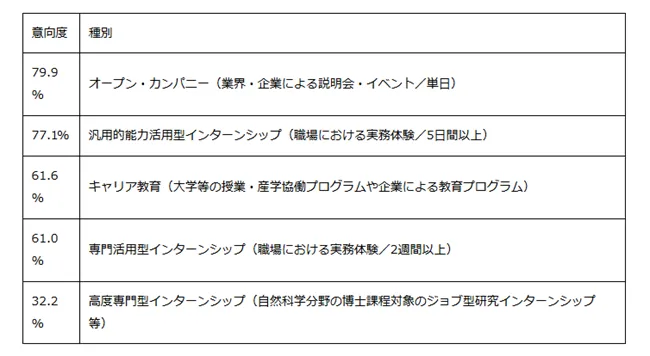 一般的にインターンシップの人気が高いと思われがちですが、オープンカンパニーも学生からの参加意向度が高いことがうかがえます。