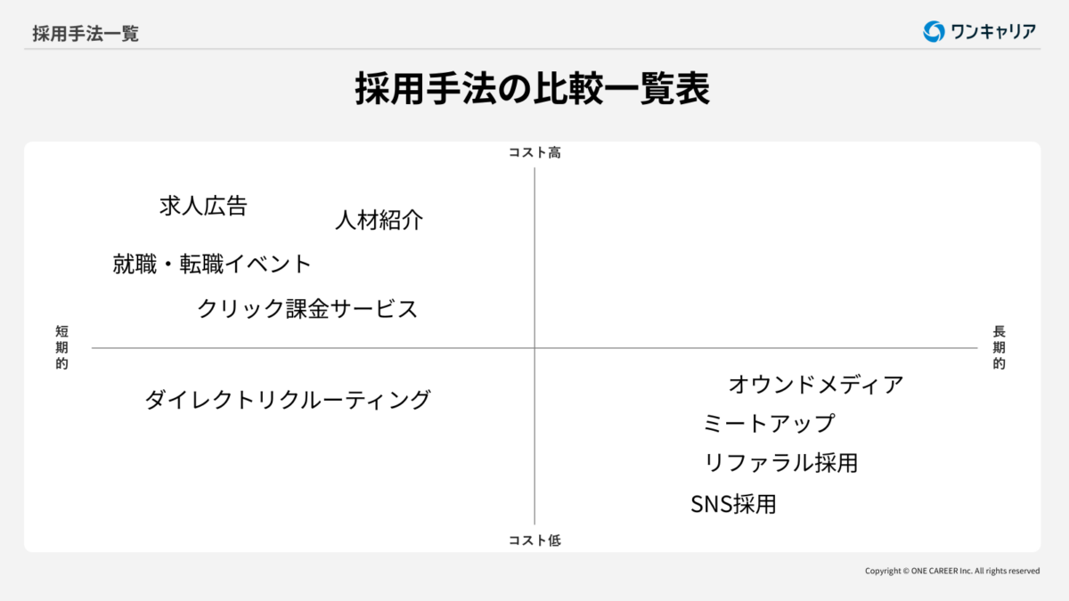 数ある採用手法の中から自社に最適なものを選ぶには、それぞれの特徴を正しく理解することが重要です。ここでは、各採用手法を「コスト(費用)」と「時間軸(短期的か長期的か)」という2つの軸で整理した比較図をご紹介します。
