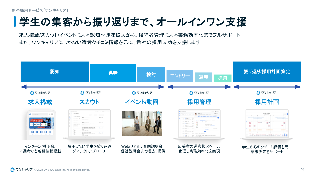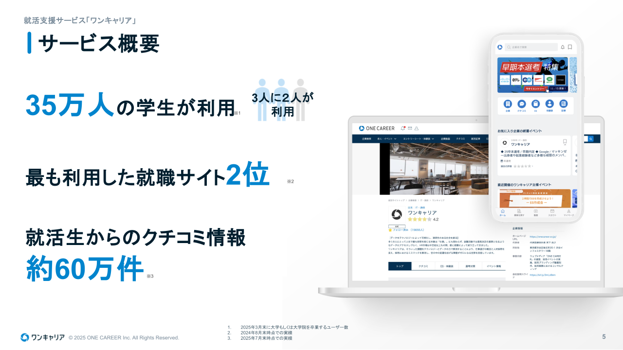3分でわかる!サービス紹介資料 こんな方におすすめはじめてワンキャリアを検討される方まずは基本的な機能を知りたい方導入事例やサービスの特徴を知りたい方 概要ワンキャリア活用を検討される方に向けて、機能概要や導入メリット、お客様の声をご紹介します。 資料で分かることサービスの特徴:解決できる課題や利用学生の特徴 等他サービスとの違い:他サービス比較 等導入事例:採用成功事例やお客様の声 等