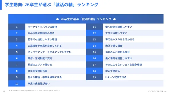 【2026卒→2027卒】押さえておくべき就活トレンド速報 こんな方におすすめ最新の就活トレンドについて知りたい2026年卒の採用を振り返り、2027年卒採用に役立てたい採用ブランディングに課題を感じている 概要ワンキャリアに登録している26卒学生が重視している就活軸をまとめました。27卒採用を検討するにあたって、ターゲット学生の理解促進にご活用ください。 資料で分かること押さえておくべき、最新の就活トレンドZ世代のキャリア選択の志向性ワンキャリアについて