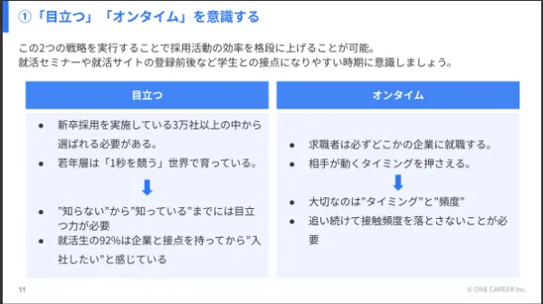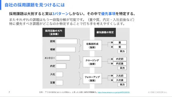 前年踏襲のやったふり採用とお別れ 本当の採用課題の見つけ方と問題解決 こんな方におすすめ採用活動の課題を明確にし、具体的な改善施策を知りたい方ターゲット層に響く採用施策を立案したい方学生との接点を増やし、認知拡大を図りたい方 概要前年踏襲の「やったふり採用」から脱却し、自社の採用課題を明確化する方法と、効果的な問題解決のステップを解説した書籍抜粋コンテンツです。 資料で分かること採用課題の見つけ方「目立つ」「オンタイム」が採用成功に与える影響についてターゲットについて言語化する重要性