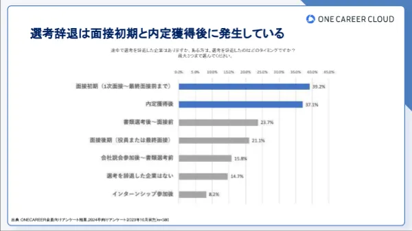 - 24卒生の就職活動を振り返り、選考や内定承諾において学生が重視したポイントを分析。オンラインとオフラインの選考形式の使い分け、選考辞退のタイミングと理由、内定後のフォロー施策の重要性など、採用活動に役立つ知見をまとめました。