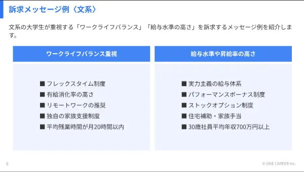 26卒はキャリア選択で何を重視する?学部別「就活の軸」ランキング こんな方におすすめ文理や学部別に異なる「就活の軸」を理解し、適切な施策を打ち出したい方 概要26卒学生を学部別に就活の軸とそれに合わせた訴求例をまとめました。ターゲット学生の理解促進にぜひご活用ください。 資料で分かること文理別、人気学部別での学生の就活の軸企業が学生に好印象を与えるための具体的な訴求メッセージ例ワンキャリアの概要