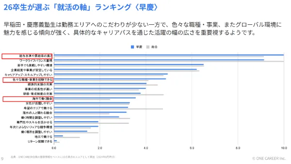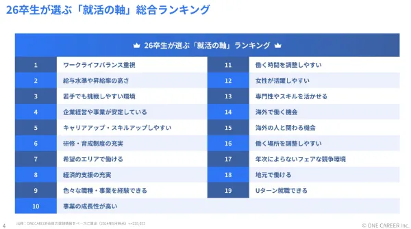26卒はキャリア選択で何を重視する?大学群別「就活の軸」ランキング こんな方におすすめ大学群ごとの学生ニーズを理解し、適切な採用戦略を練りたい方 概要26卒学生を大学群別に就活の軸とそれに合わせた訴求例をまとめました。ターゲット学生の理解促進にぜひご活用ください。 資料で分かること大学群別での学生の就活の軸企業が学生に好印象を与えるための具体的な訴求メッセージ例ワンキャリアの概要