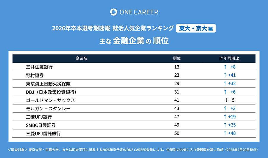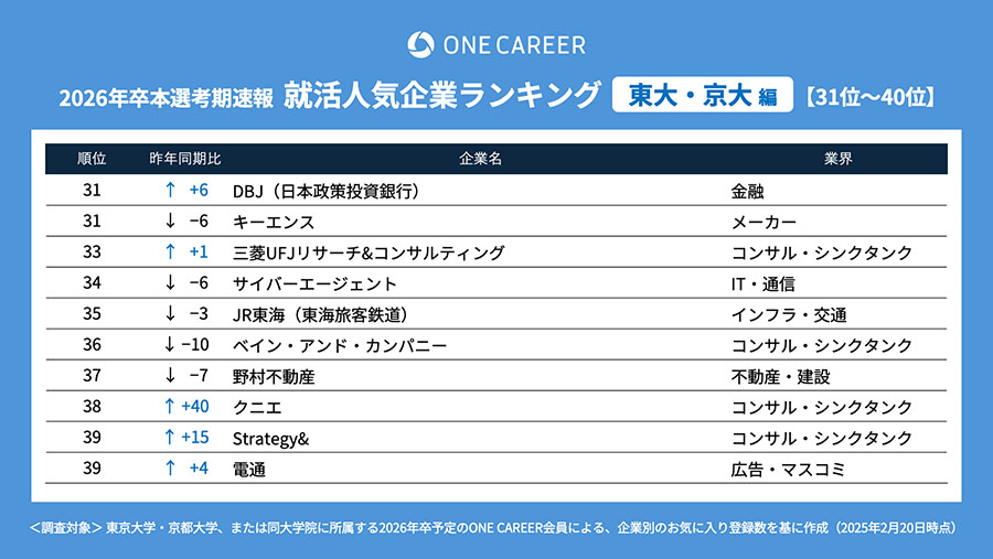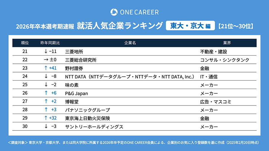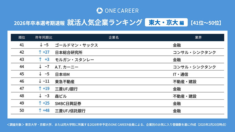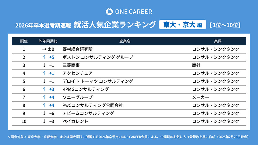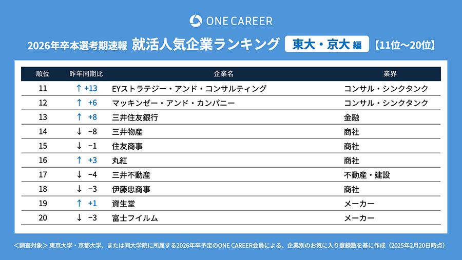 就活人気企業ランキング【東大・京大編】(26卒本選考期速報)順位一覧