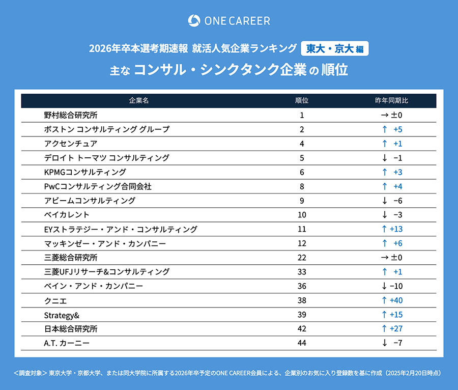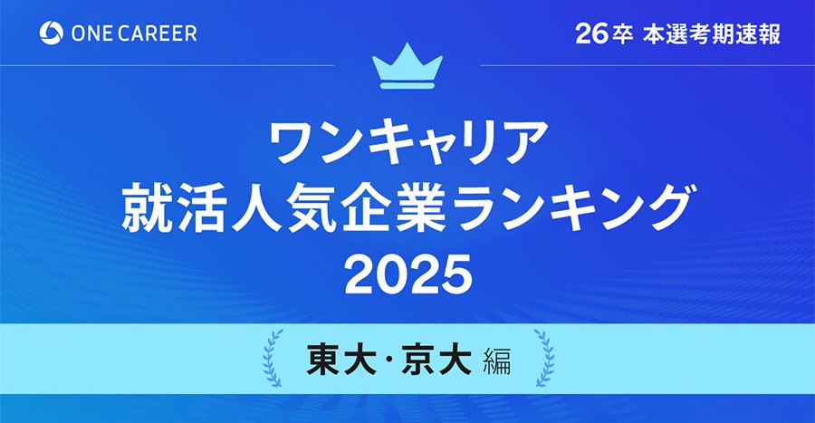 “はじめてのキャリアを選ぶ、就活サイト”「ONE CAREER」を運営する株式会社ワンキャリア(本社:東京都渋谷区、代表取締役社長 執行役員CEO:宮下 尚之、以下ワンキャリア)は、「ワンキャリア就活人気企業ランキング【東大・京大編】26卒本選考期速報」を発表しました。