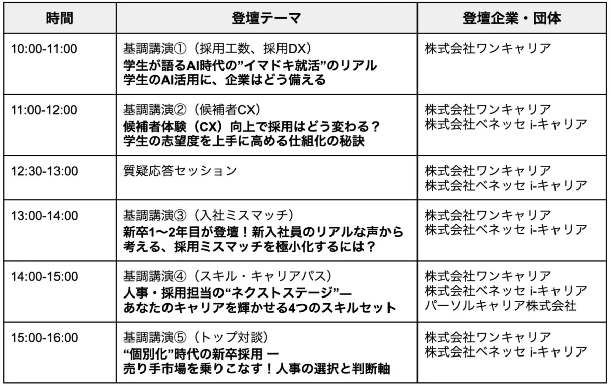 新卒採用サービス「ワンキャリア」を提供する株式会社ワンキャリア(本社:東京都渋谷区、代表取締役社長 執行役員CEO:宮下 尚之)は、新卒オファーサービス「dodaキャンパス」を運営する株式会社ベネッセ i-キャリア(本社:東京都新宿区、代表取締役社長:風間 直樹)と、2025年9月16日(火)から19日(金)に企業人事向けオンラインカンファレンス「新卒採用カンファレンス 2025秋」を共同開催します。このたび、本カンファレンスの基調講演のテーマが決定いたしましたので、お知らせいたします。