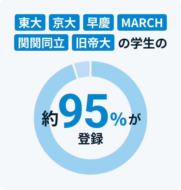 多数登録旧帝大・早慶・GMARCH・関関同立学生の約95%が登録。ガクチカや志望業界などプロフィール情報を丁寧に入力した学生も多く、積極的な学生との接点を創出します。- 2023年6月末時点。2024年に大学もしくは大学院を卒業するユーザーの、