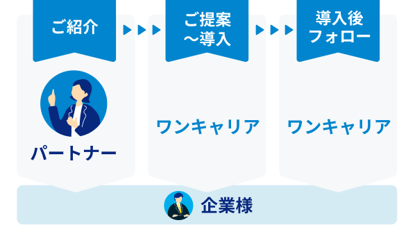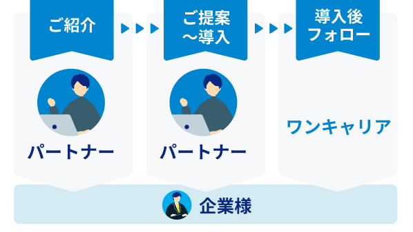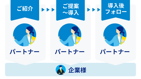 新卒採用でお困りの企業様にご提案〜導入まで実施いただくパートナー様。導入後のフォローは弊社にお任せいただけます。