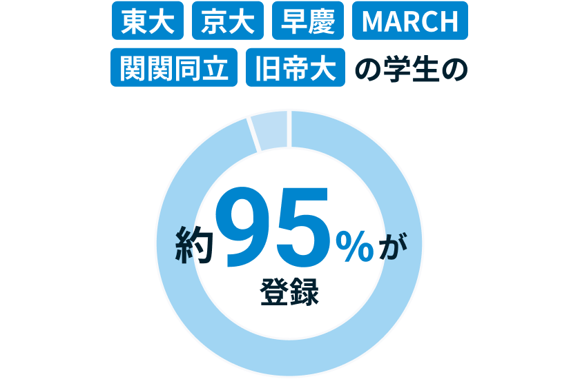 アクティブな学生が多数登録しています。- 旧帝大他:北海道大学、東北大学、名古屋大学、大阪大学、九州大学、MARCH、関関同立、 その他国立(一橋大学、東京科学大学、筑波大学、神戸大学、広島大学)を指す。