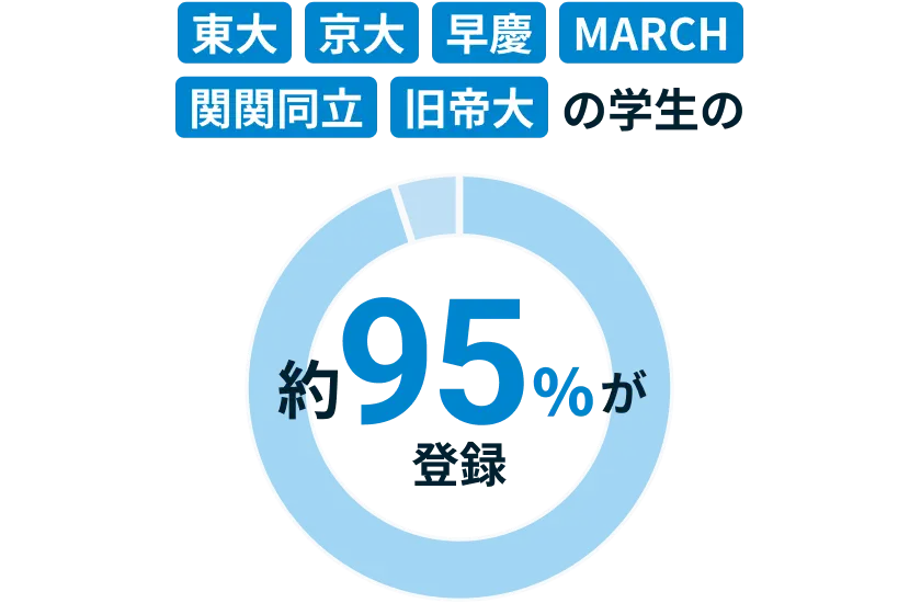 アクティブな学生が多数登録しています。- 旧帝大他:北海道大学、東北大学、名古屋大学、大阪大学、九州大学、MARCH、関関同立、 その他国立(一橋大学、東京科学大学、筑波大学、神戸大学、広島大学)を指す。