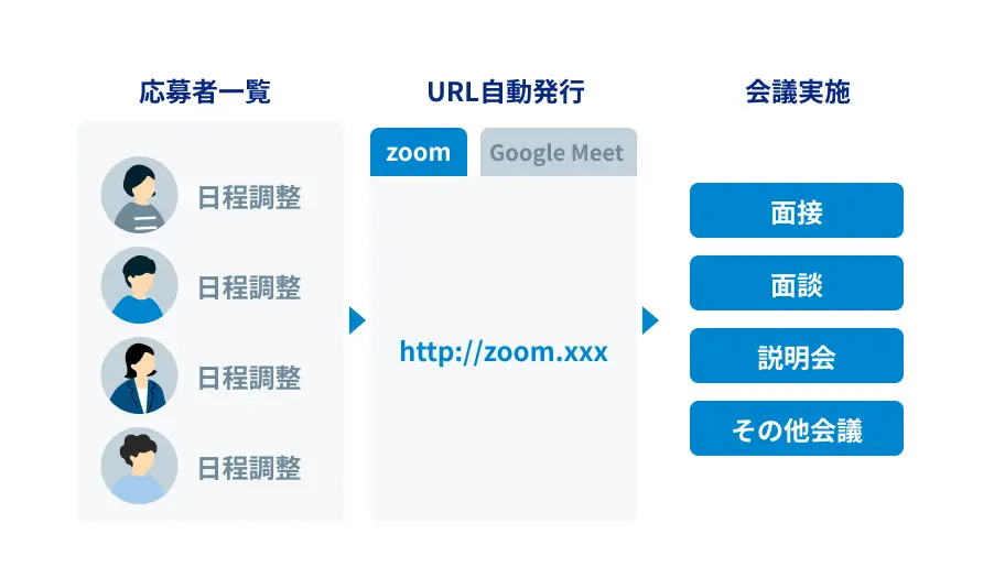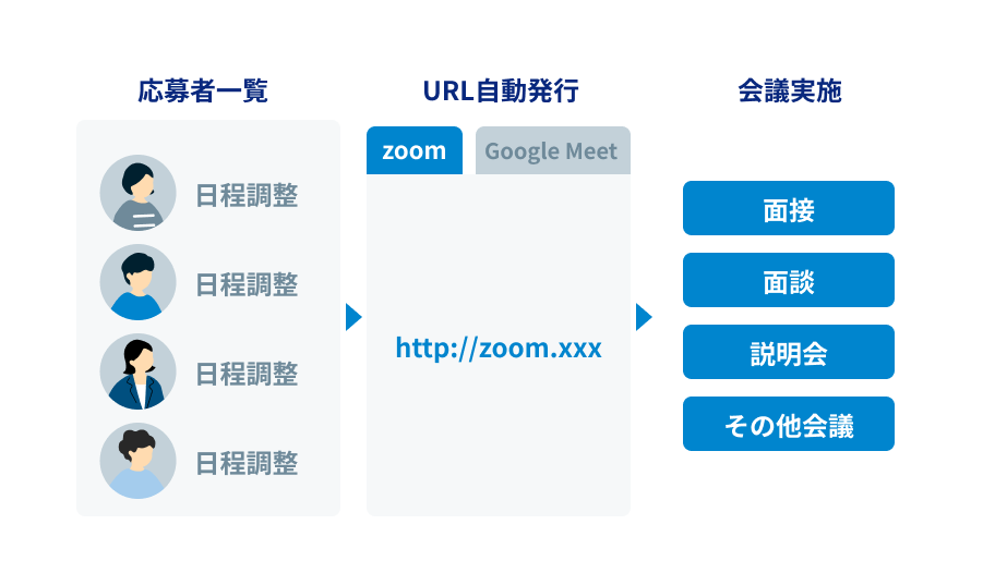 Zoom、Google Meetと連携。システム上で会議URLをワンクリックで発行できるため、手間がありません。