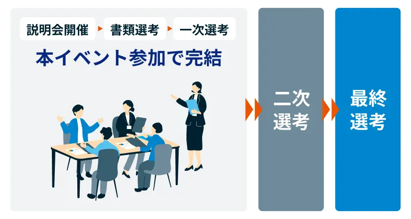 - 一次選考には、書類選考は含まれておりません。本イベントでは、書類選考の次選考を「一次選考」と定義しております。便宜上、ES提出が必須な場合等は、対象学生本人に当日告知する必要があります。