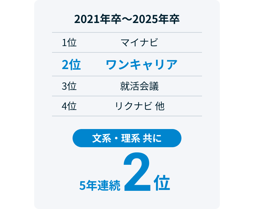 ワンキャリアは2025年卒学生の登録率60%※1で3人に2人が利用、さらに学生利用率5年連続2位を獲得※2している媒体です。- 2025年3月に大学もしくは大学院を卒業するユーザーの、卒業年度別学生の総数に対するシェア率。