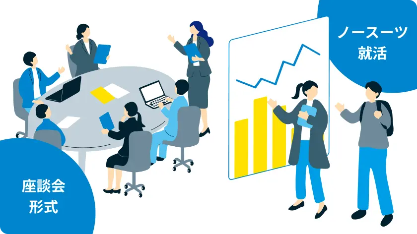 一方的なプレゼン形式の説明会を改め、現役社員とカジュアルに意見交換ができる座談会形式を取り入れています。学生と企業の接触の密度が上がることで、欲しいターゲット学生の見極めにも繋がります。 -